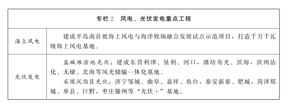 1、風電。以海上風電為主戰場,積極推進風電開發。加快發展海上風電。按照統一規劃、分步實施的總體思路,堅持能建盡建原則,以渤中、半島南、半島北三大片區為重點,充分利用海上風電資源,打造千萬千瓦級海上風電基地。推進海上風電與海洋牧場融合發展試點示范,加快啟動平價海上風電項目建設,推動海上風電規模化發展。科學布局陸上風電。適度有序推進陸上風電開發建設,重點打造魯北鹽堿灘涂地千萬千瓦級風光儲輸一體化基地。到2025年,風電裝機規模達到2500萬千瓦。